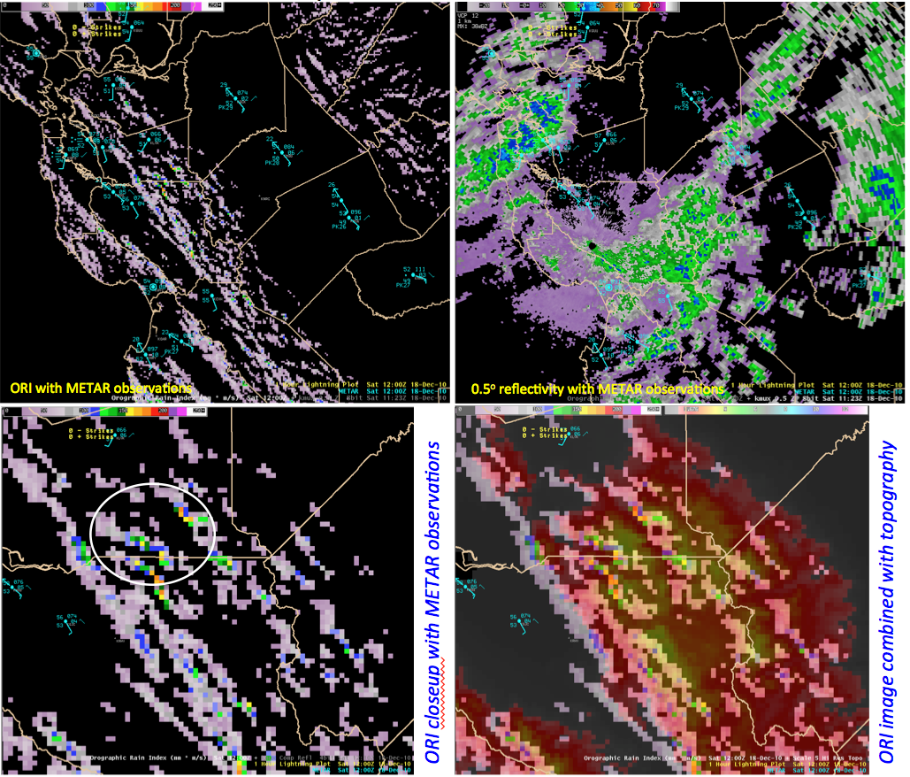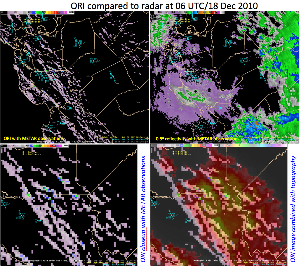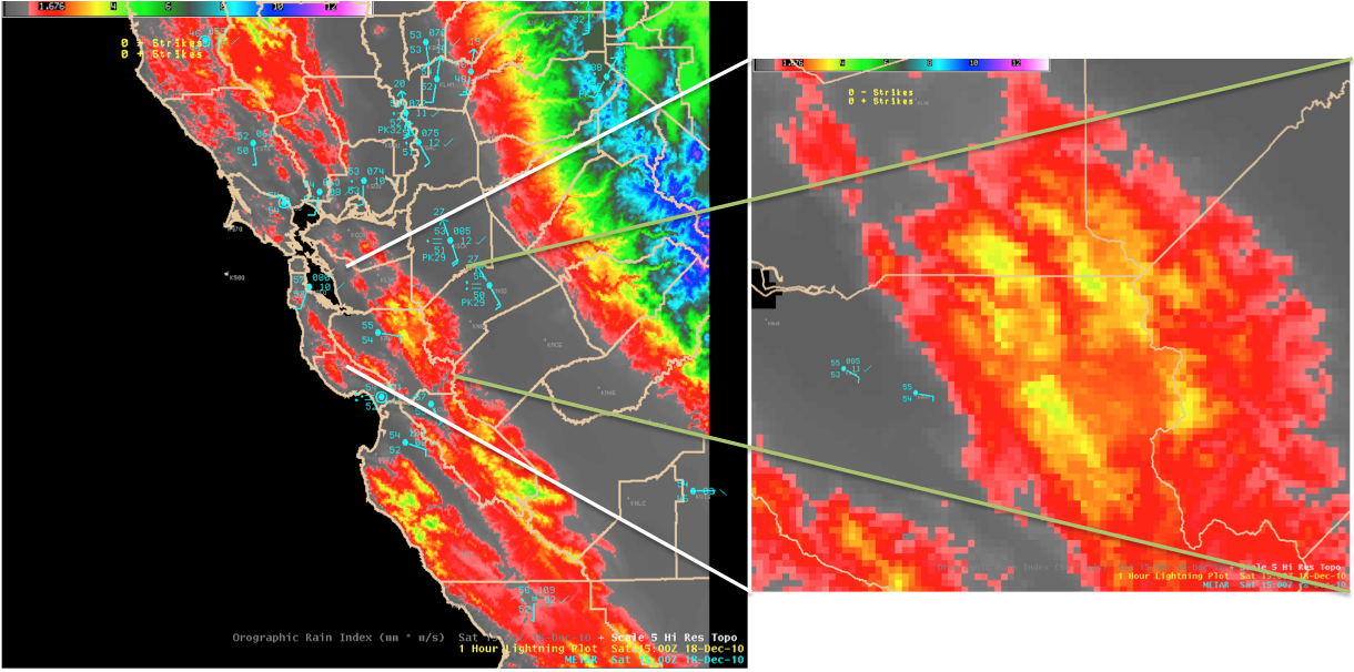 A period of extremely heavy rain and massive higher elevation snow hit California and other portions of the West during mid-December 2010. Here we take a look at the ORI product for a portion of this storm, concentrating on Central and then Southern California. The ORI (for Orographic Rain Index) product is designed to indicate to forecasters where there is short-term (0-3 hours) potential for heavy orographic rain. The product has a horizontal resolution of approximately 1 km.