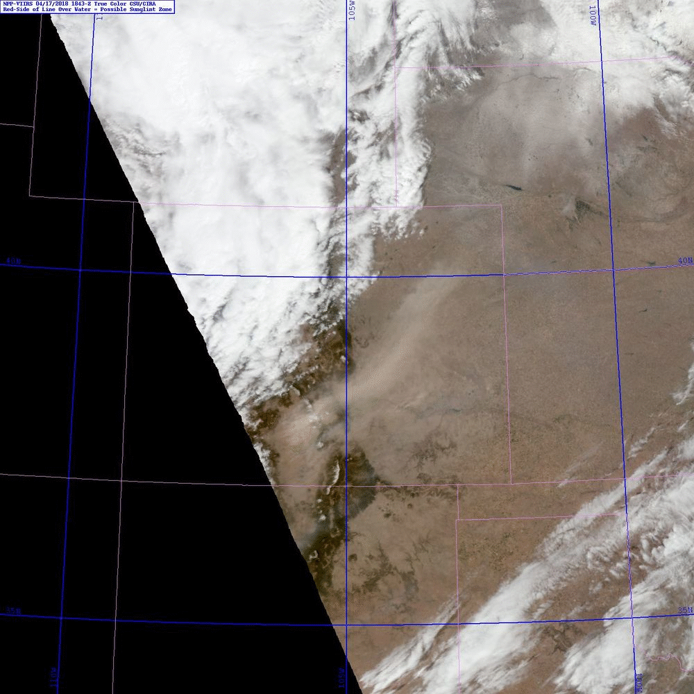 The dust storm was also seen via satellite by the Suomi-National Polar-orbiting Partnership (S-NPP) at 1843Z and 2026Z, 17 April 2018. Below are two satellite products observing the atmospheric phenomena.